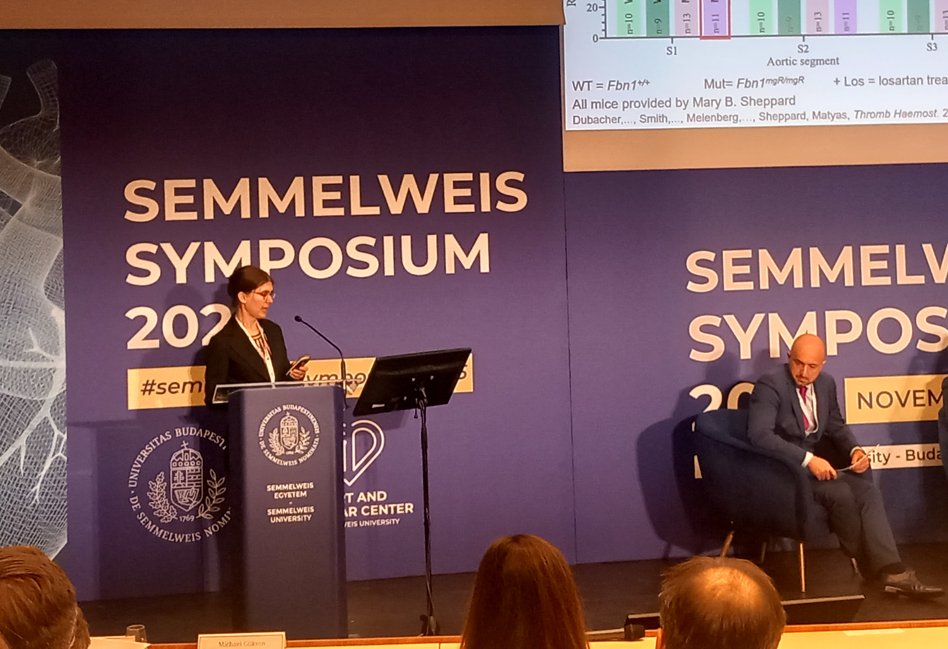 A szekciót Alapítványunk együttműködő partnere, a svájci, zürichi Kardiovaszkuláris Genetikai és Géndiagnosztikai Központ egyik oszlopos tagja, Dr. Janine Meienberg előadása zárta. Dr. Meienberg a modern genomikai módszerek, különösen a teljes genomszekvenálás (WGS) és a farmakogenetikai vizsgálatok örökletes mellkasi aortabetegségek diagnosztikájában és kutatásában betöltött szerepét ismertette. A farmakogenetikai kutatások témakörén belül bemutatta egy a szív-érrendszeri betegségek kezelésben általánosan használt gyógyszer, a losartan hatásának genetikai szinten történő vizsgálata során kapott eredményeiket. Kitért azokra az állatkísérletekre is, amelyek keretében a genetikai eltérések szövetszintű hatásait és biomechanikai következményeit vizsgálták. Előadásának egyik fontos üzenete egy vérnyomáscsökkentő, a celiprolol kedvező hatásainak bemutatása volt: az egérmodellek eredményei alapján a gyógyszer jelentős potenciállal bír az aortafal biomechanikai stabilitásának javításában és a disszekció kockázatának csökkentésében.